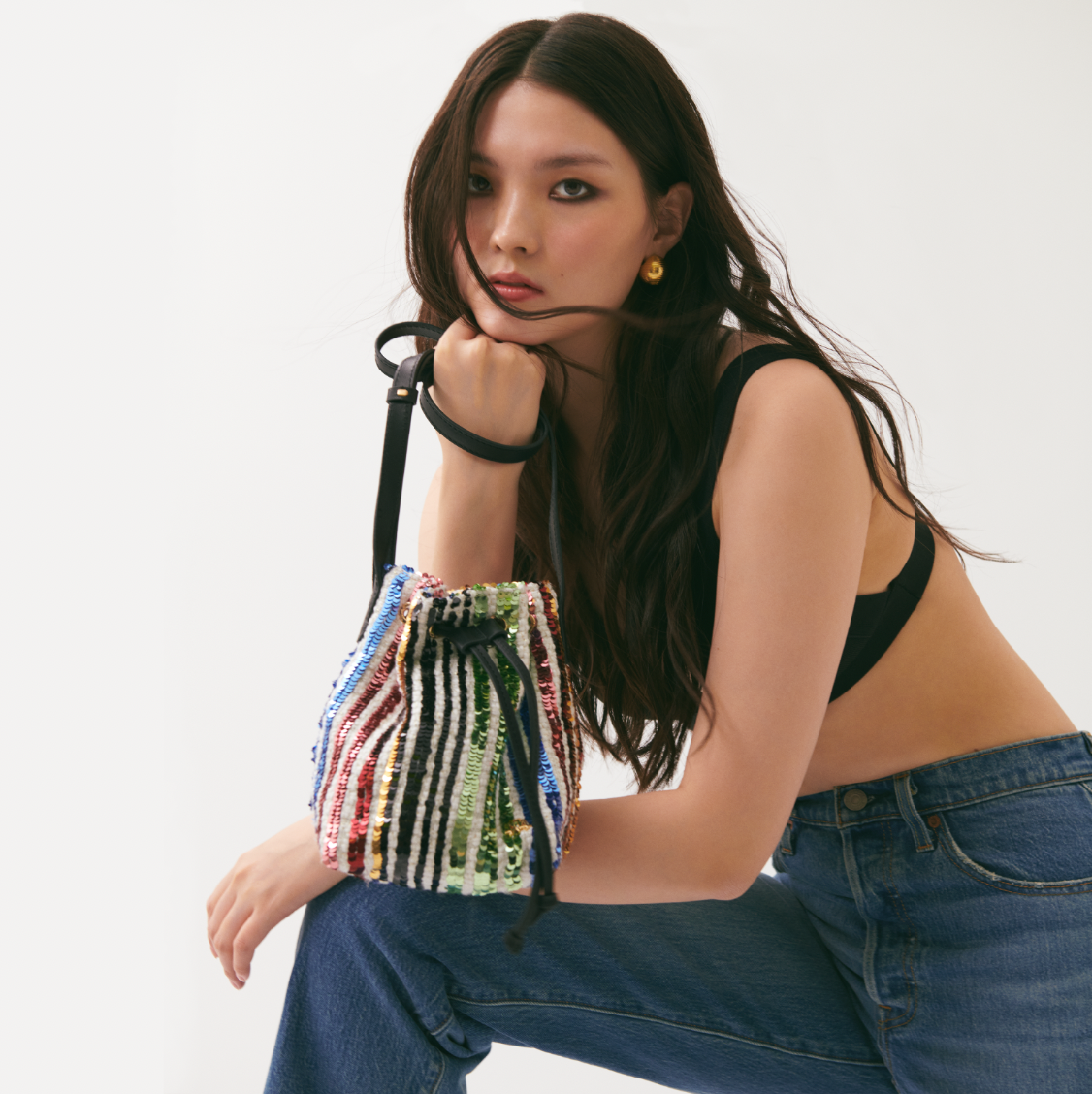Multicolor-striped color sequin-embellished tweed fabric bucket bag